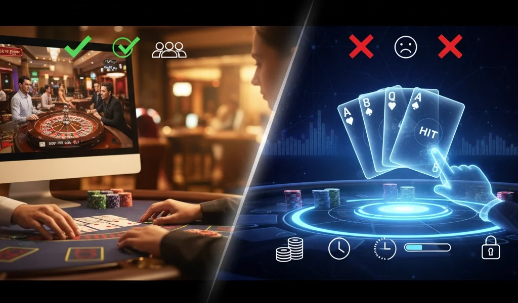 Al evaluar estas diferencias, considera también cómo influyen en tu disciplina de juego: la velocidad del virtual puede tentarte a apostar más rápido, mientras que el factor social en vivo puede mejorar tu disfrute pero también alargar las sesiones. En la siguiente sección, entraremos en detalle en las ventajas y desventajas concretas de cada formato, incluyendo aspectos de RTP, límites de apuesta, interacción y costes asociados.